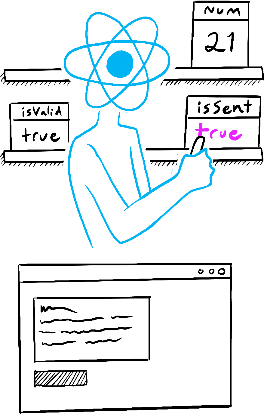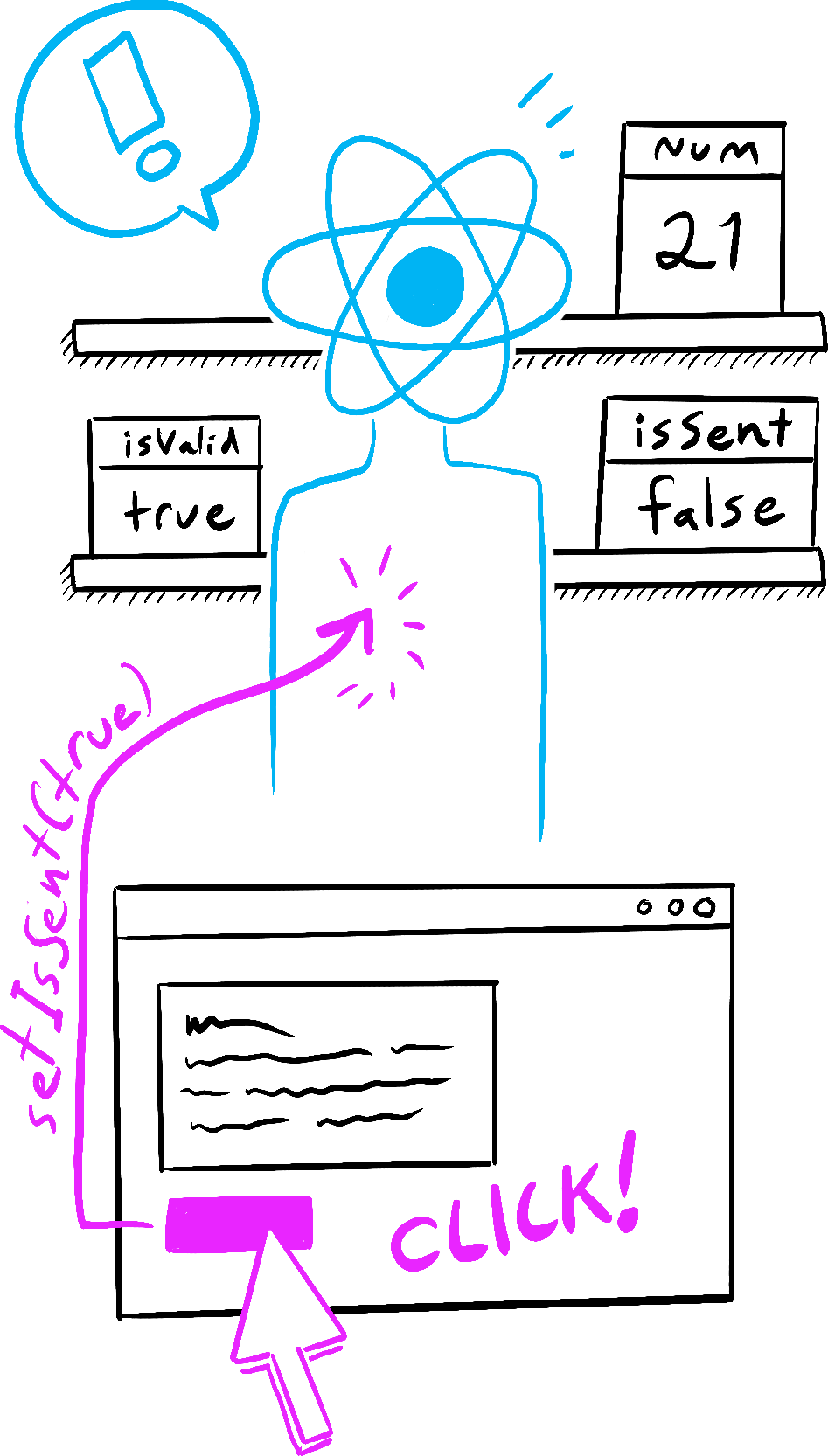 onSubmitດຳເນີນການ. setIsSent(true)ຕັ້ງຄ່າisSentເປັນtrueແລະ ຈັດຄິວການ render ໃໝ່.- React ຈະ render component ໃໝ່ຕາມຄ່າ